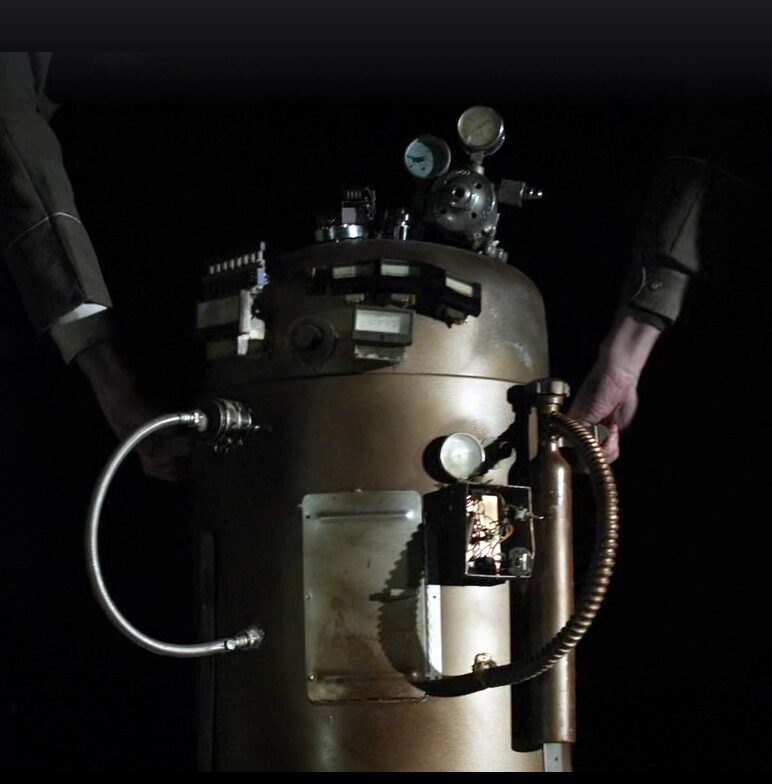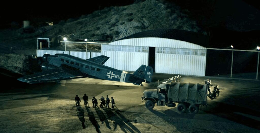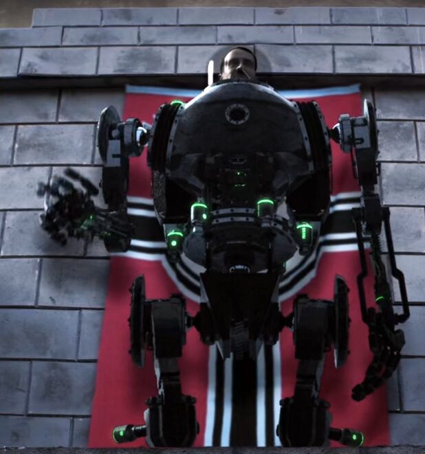 The rest of the movie takes place in modern day, in the Arctica North Pole. A team of scientists are doing what scientists do in the arctic when they stumble across Nazi zombies. This leads to a secret base in hollow earth where Mengele is keeping his little army of Nazi’s alive through regrafting of body parts and organs as they fail, from victims brought to him by the Traitor – Jake Busey’s character – who was also of German decent and easily seduced by Mengele and his experiments for immortality. His ultimate goal involves the steampunk container – which contains Hitler’s head. Mengele installs into an alien tech/steampunk robot body to resurrect the Führer. Also, the whole base is actually a giant flying saucer built by the Nazis from alien tech they found (earlier mentioned).