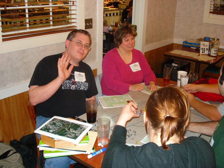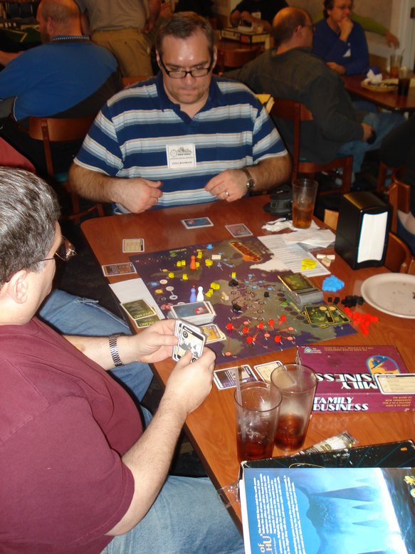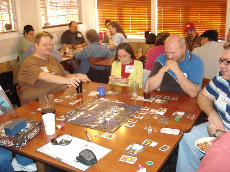 Unfortunately, the game was interrupted by my clumsiness. It is always a risk when running games at the Golden Corral that food or drink will get on your game. I have taken that risk every year with no problems. This time, I spilled a glass of water all over the skill cards and loyalty cards, Ugggh. We were able to save most of it, and then use some one else’s components while mine dried out. Thanks Jim. The humans lost again in the end but came fairly close with 6 Jump points. The Cylon poker chip method seemed to work pretty well.