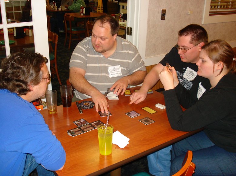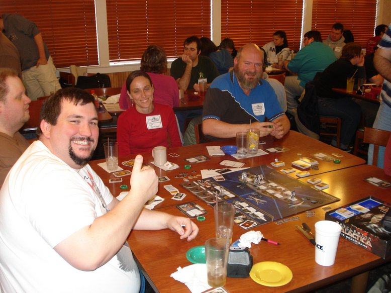 My first game gathered players fairly quickly – Battlestar Galactica the Board Game always seems to get players. I volunteered to marshal rather than play so that others could play. This time, we tried a house rule to fix a flaw I found in the game. Instead of handing out the Loyalty cards, I wrote on poker chips either a C or an H, and everyone randomly drew poker chips. I also added a S poker chip to include the sympathizer. Once the Cylon revealed himself or herself, they would draw from the Cylon loyalty cards to get their special reveal event.