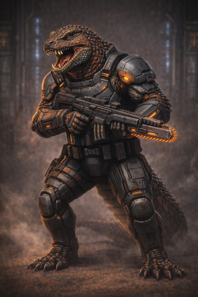 The S’saran are a reptillian race, resembling a cross between a terrestrial komodo dragons and a terrestrial gila monster. They are blackish green in color, with visible scales, and no fur. They developed from a larger killer omnivore.